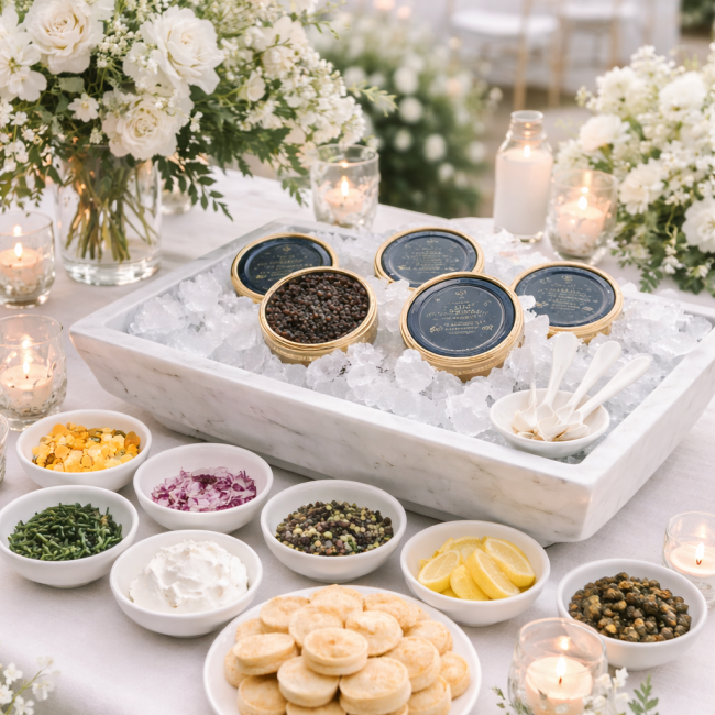 Add a touch of luxury to your celebration with a beautifully presented caviar station. Guests can enjoy premium caviar served with classic accompaniments, creating a sophisticated and memorable tasting experience.